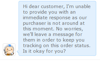 Since she can't do anything without the purchaser, I said I'll wait to see if it reaches warehouse tonight. I thanked her. She sent the template "You are most welcome!" & ended with: