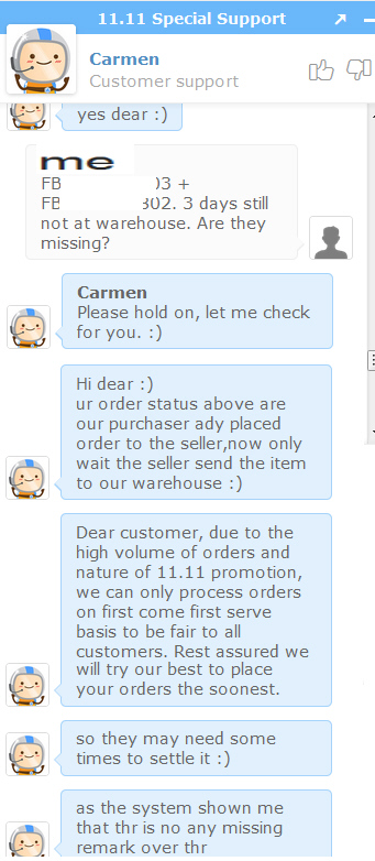 Notice that this chat box is 11.11 "special" & they are not entertaining normal orders with problems. When I saw this, I already knew this was bad. Commonsense. How can you do this? Some customers need help urgently with their "normal" orders. For 1 day, they can't ask about their orders? *shakes head* China people really... do things differently.